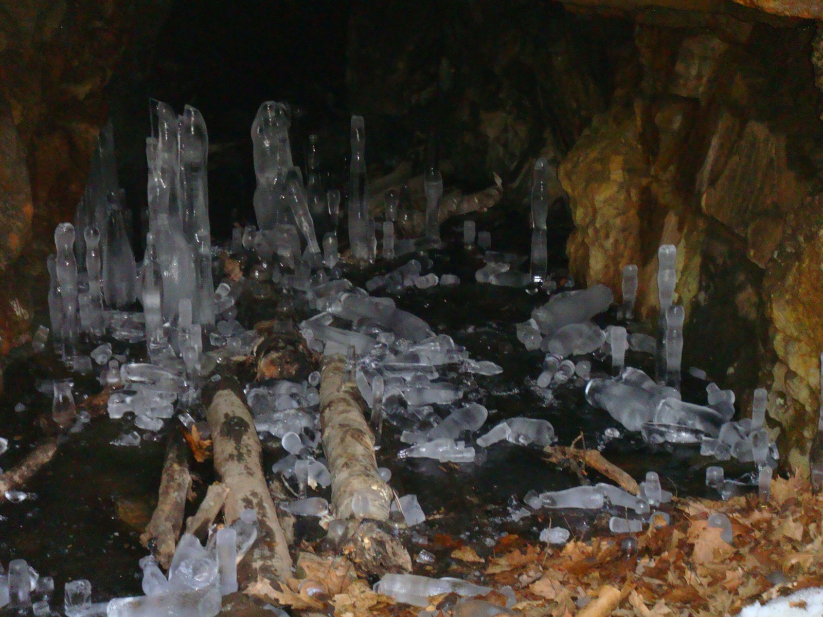 As we know, frost only penetrates the ground approximately 3 feed deep. Inside this mineshaft it is therefore well above the freezing point. Cold heavier air flows an the bottom of the shaft into the mine as warmer lighter air exits the mineshaft along the ceiling of the shaft, thus preventing icicles from forming in the normal familiar way! Nature never ceases to amaze me.. I wonder how close the icicles will ever get to the top due to the warm air preventing the water dripping from the ceiling to freeze.