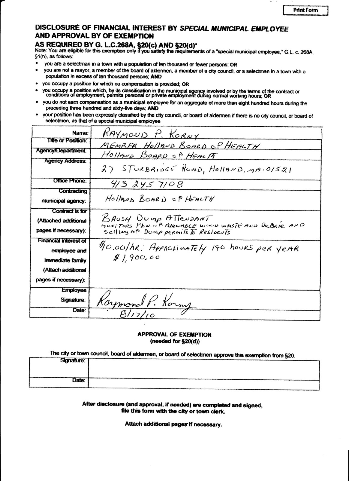 (d) to a special municipal employee who files with the clerk of the city, town or district a statement making full disclosure of his interest and the interests of his immediate family in the contract, if the city council or board of aldermen, if there is no city council, board of selectmen or the district prudential committee, approve the exemption of his interest from this section,The form is not mandatory; if Korny has nothing to disclose (no interest in contracts) he has no reason to submit such a form!