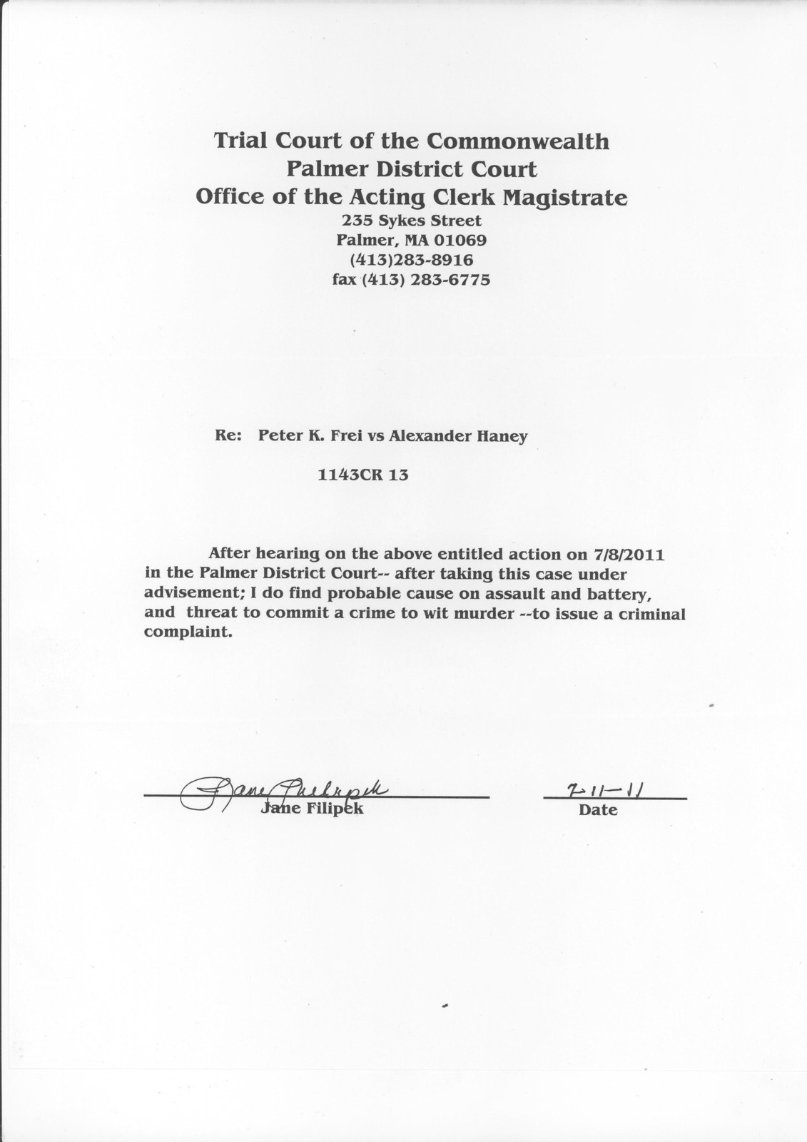 Haney lawyered up for the show cause hearing last Thursday, July 8, 2011 at Palmer District Court. During the hearing, Haney’s lawyer claimed that I’m the instigator and aggressor, but First Assistant Clerk Magistrate Jane A. Filipek didn’t seem to buy it.